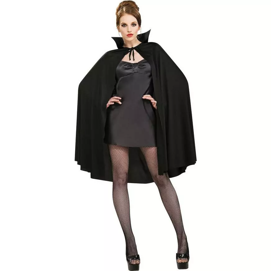 Drape yourself dramatically with our classic Deluxe Black Cape, a midlength 100% polyester drape with front tie closure and foam filled collar. One size fits most adults.