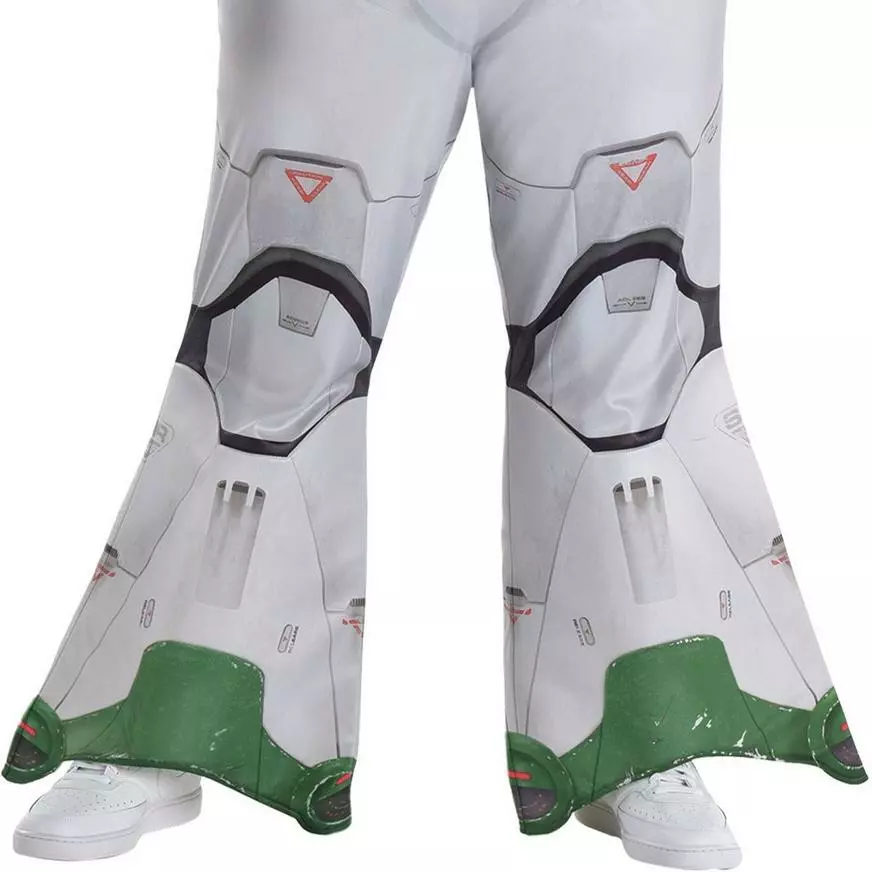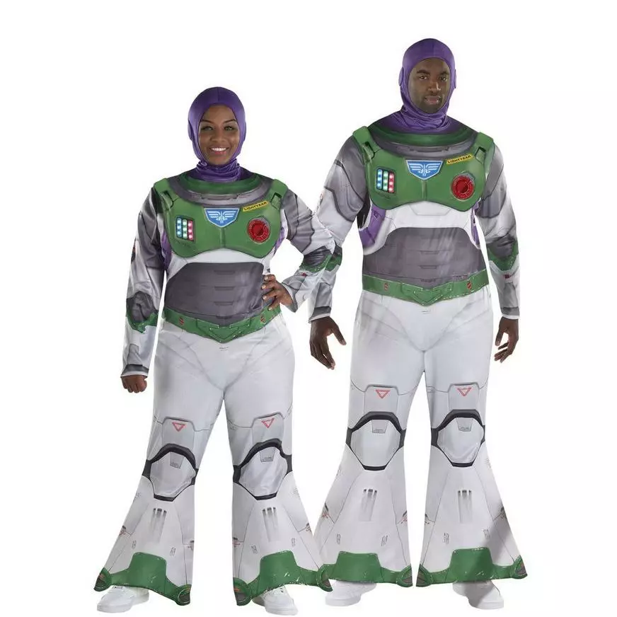 Suit up for an exciting Halloween mission with this officially licensed, plus-size Buzz Lightyear costume. It includes a purple hood and a structured chest piece with a light up panel, all paired with a jumpsuit with printed designs and a flared hem.