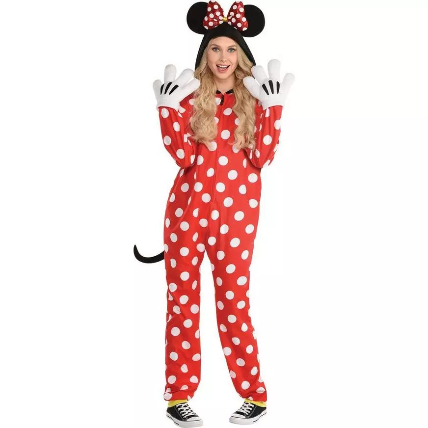 Get ready to be the coziest and cutest mouse around town. This red Minnie Mouse one-piece for adults features white polka dots, yellow ankle cuffs, and a large black hood that features Minnie’s ears and iconic red bow. Slip on the stuffed gloves and your look is complete.