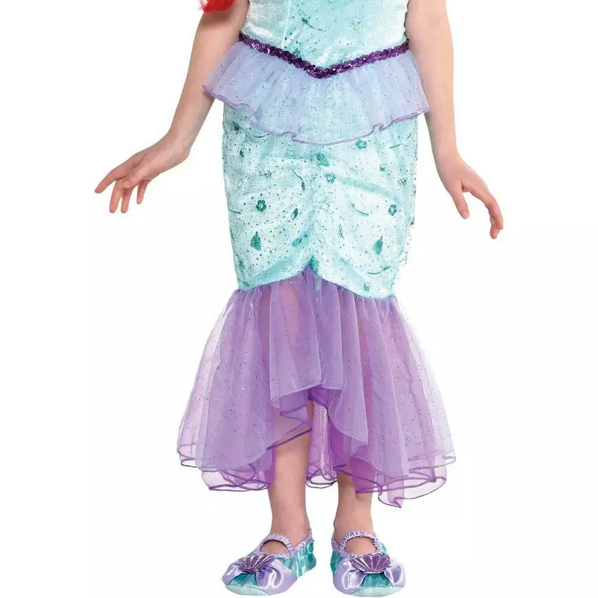 More on The Little Mermaid Child Ariel Costume: Make a splash with this adorable Ariel Costume for kids! The purple and teal dress is printed with glitter shells and swirl details. It flares out at the bottom into a mermaid shape with layers of purple mesh that match the purple peplum waist. In the middle of the chest is a cameo with a picture of Ariel at the center. Halloween will go absolutely swimmingly when your child is dressed in this Little Mermaid costume! Review the size chart for additional information. Shoes and wig not included.