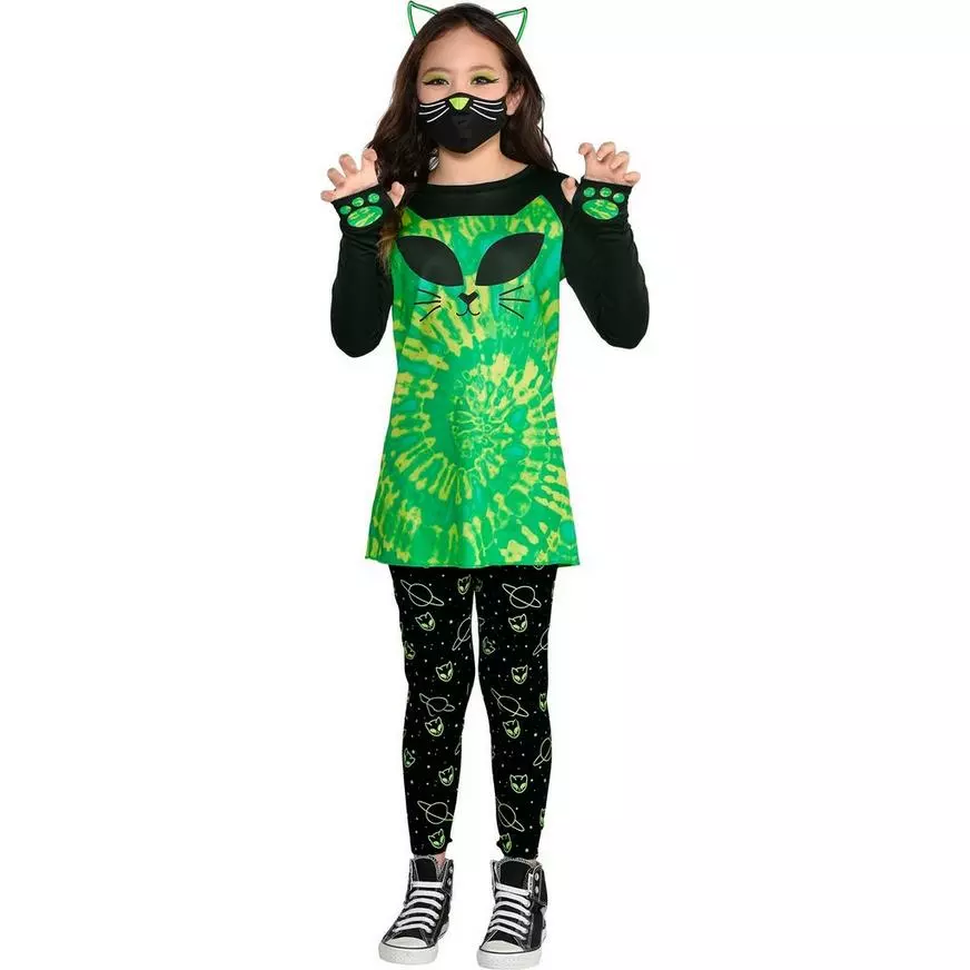 Your kid is outta this world as the Cosmic Kitty! This quirky costume features a tunic printed with green tie-dye and a feline face. A light-up cat ears headband and leggings printed with planets and cat aliens complete the otherworldly space cat look.