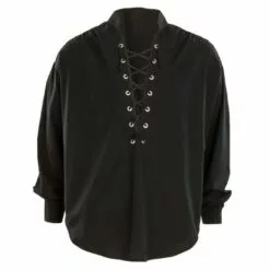 Win booty and lasses in this Black Lace-Up Pirate Shirt! This black collared pirate shirt features a mock collar, relaxed fit, and center lace-up for baring your chest. A relaxed fit and metallic grommets lend an authentic look, and it’s an excellent foundation for your pirate costume!