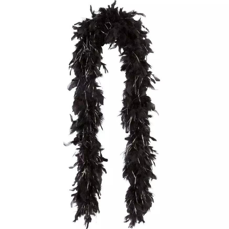 Wrap yourself in glamour with our Black with Silver Tinsel Feather Boa. This black feather boa features strands of silver tinsel to give a little sparkle to a traditional feather boa. This feather boa is the perfect finishing touch to a burlesque costume or a fun accessory to wear to a parade. Black with Silver Tinsel Feather Boa measures 72in.