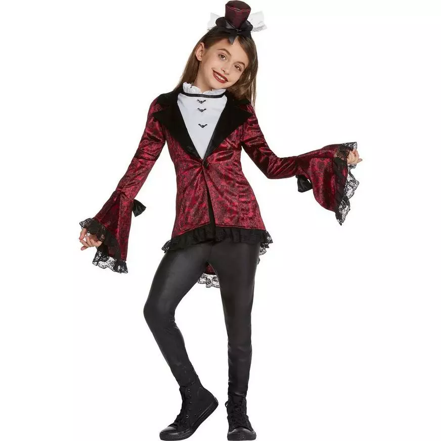 More on Child Vampire Costume: Folks are in for a scare when your little one is walking around in this Vampire Costume for kids! The costume set includes a deep red jacket with lace-lined bell sleeves and an all-over ikat design. Sleek black pants allow them to move around at night without being spotted by mortals. The bat-shaped values on the white faux shirt make the whole ensemble frighteningly fabulous. Top it all of with the padded top hat headband and they’re ready to feed on candy! Review the size chart for additional information. Shoes not included.