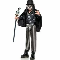 More on Child Voodoo Legba Costume: They’ll hold the power to communicate with those who have passed in this Voodoo Legba Costume for kids. The black top hat, textured cape, skull-printed shirt, and striped pants come together for the perfect voodoo outfit. Bone details on the necklace and belt complete the look and bring them one step closer to the other side. Review the size chart for additional information. Shoes, makeup, and cane not included.