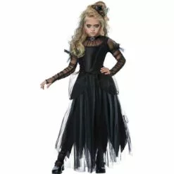 More on Girls Dark Princess Costume: If your daughter thinks colors are too bright and happy, she’ll love the Dark Princess Costume for girls. This evil princess costume features a black dress with a corset-inspired top and mesh sleeves. To add an extra level of creepiness, she can put on the tattered black tulle overskirt and black tiara. This gothic princess costume is the perfect scary outfit for Halloween! Review the size chart for additional sizing information. Shoes, pants, and makeup not included.