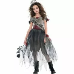 She’s just dying to be your date for prom! Our Prom Corpse Costume for girls features a gray gown with red rose appliques at the neckline and sleeves, a tattered tulle skirt with uneven hems and a removable red brocade print belt. A corsage of red roses and matching gray tulle goes on the wrist, and a tiara and sash crown you the prom queen from hell!