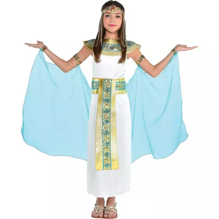 Walk like an Egyptian princess! Girls Shimmer Cleopatra Costume features a silky ivory dress with a gold and turquoise belt attached, a metallic gold and turquoise collar, and a royal headdress. Add elegance with a sheer turquoise cape with gold arm and wristbands!