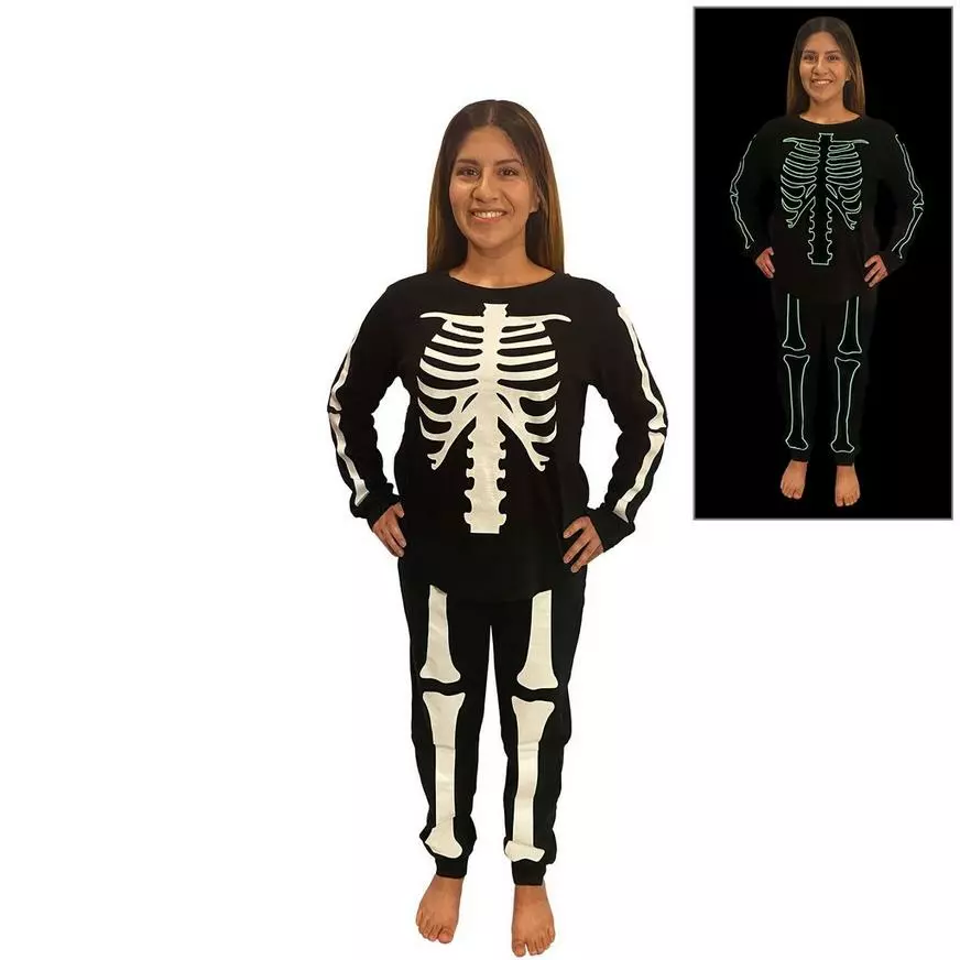 Get cozy after the Halloween party with skeleton pajamas for women! The matching set features a white skeleton print on the black shirt and pants that glows in the dark.