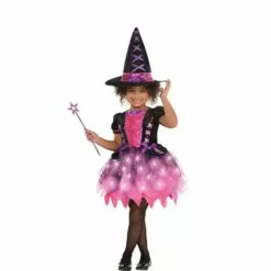 Let your little one shine with our Light-Up Sparkle Witch Costume for girls! Featuring a pink purple and black dress with a tutu skirt this witch costume is magically girly. Hidden lights gleam from under layers of pink and purple tulle and the hidden battery keeps the magic a mystery. Puff sleeves and a lace-up bodice complement the pointed witch hat. Complete her Light-Up Sparkle Witch Costume with the purple star wand and she’s ready for enchanted playtime! Girls Light-Up Sparkle Witch Costume includes: Light-up dress Hat Wand Spot clean only.