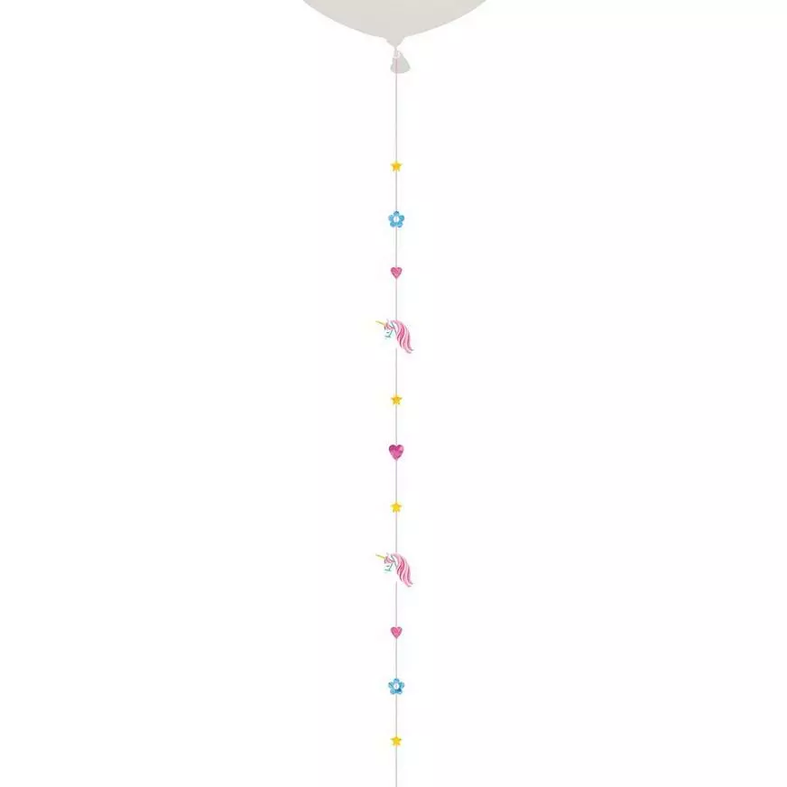 Unicorns will be flying at your little one’s birthday party when you tie this Magical Unicorn Balloon Tail to the balloons! A balloon tail featuring cardstock and plastic cutouts of unicorns, hearts, flowers, and more will add some decorative color to the rest of your unicorn party decorations. Simply tie your balloons to this balloon tail and hold them in place with a balloon weight to decorate for your child’s unicorn birthday party!