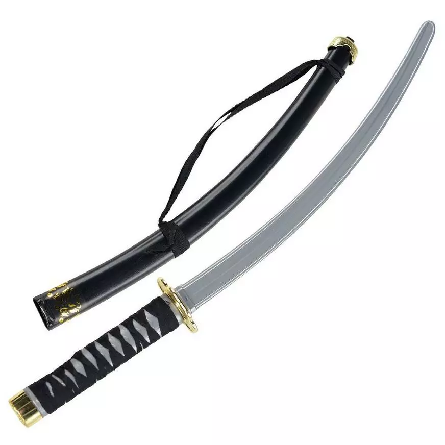 Arm yourself, ninja warrior! This plastic Ninja Sword features a classic design with recurved silver blade blunted for safety, a “brass” hand guard and pommel, and a hilt wrapped with real black cord. The Ninja Sword comes with a black plastic sheath, embellished with gold characters and equipped with a black cord shoulder sling.