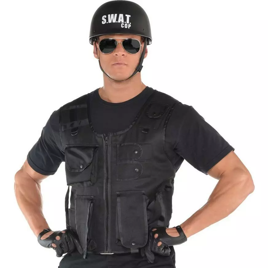 They will have no fear when you and this SWAT Cop Vest are near! Showcase your bravery in this SWAT vest which features real and faux pockets, a “S.W.A.T. Cop” headline printed on the back, a zipper front, and lace-up drawstring cord sides for comfort while you’re saving the day at the Halloween party. Use this SWAT Cop Vest as part of your overall SWAT costume for a truly tough look!